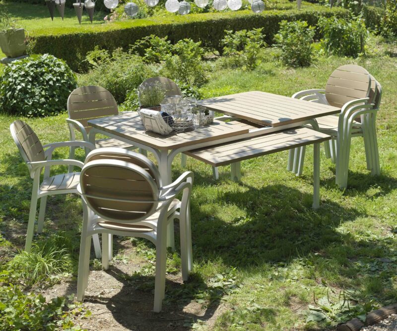 It is built of a polypropylene & fiberglass resin, and that means way less maintenance than the classic timber or teak garden furniture!