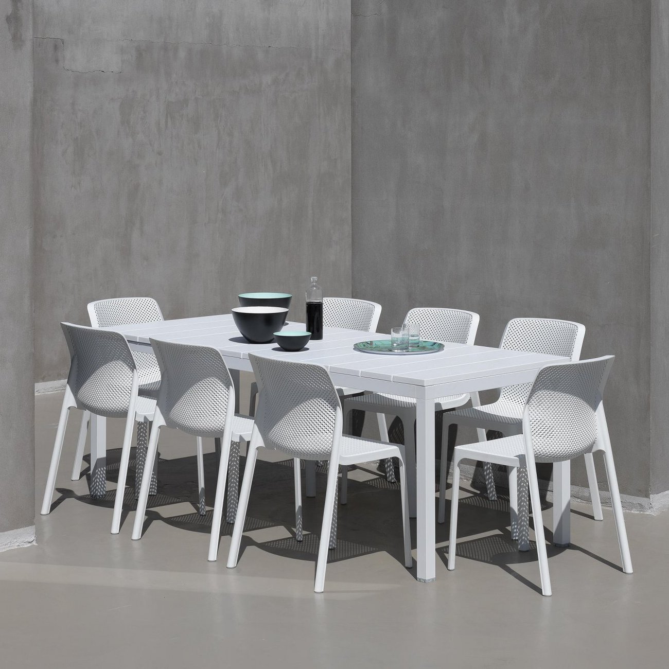 The Bit Rio 9-Piece Dining Setting is the combination of the Bit Bistro Chair & Rio 140/210 Extendable Outdoor Dining Table, with the table in its extended form to fit 8 chairs (it suits 6 chairs better in its native 140cm length). The beautiful Bit Bistro Chairs are the result of complex 3D modelling, with beautiful & ergonomic contours and lines and a diamond perforated style that’s not only super-chic but functionally promotes water run-off and allows breathability on hotter NZ summer days.