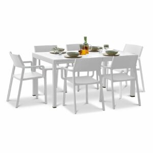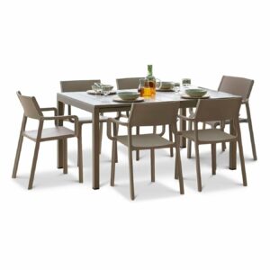 Bring contemporary European style & grace to your patio with this beautiful Italian made & designed Outdoor Extendable Dining Set. Made with commercial-grade Polypropylene & Fiberglass Resin that’s UV & Weather resistant and ultra-low maintenance, requiring just a wipe down with mild soap & water solution.