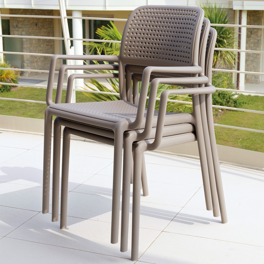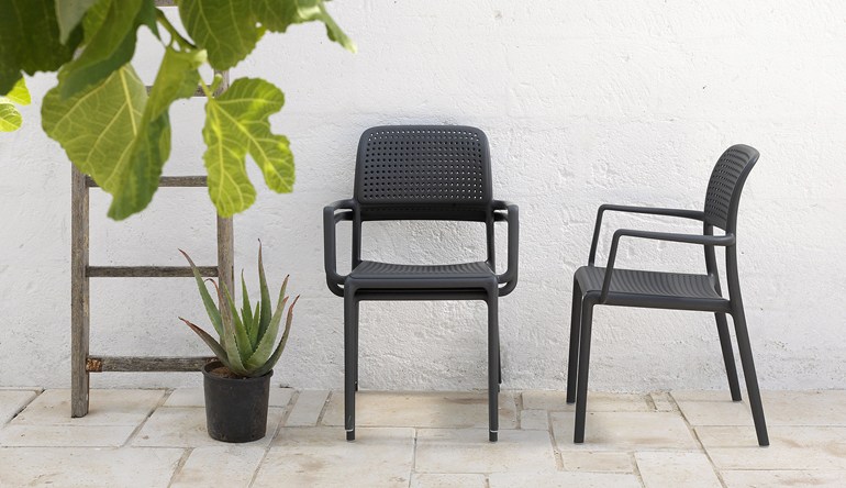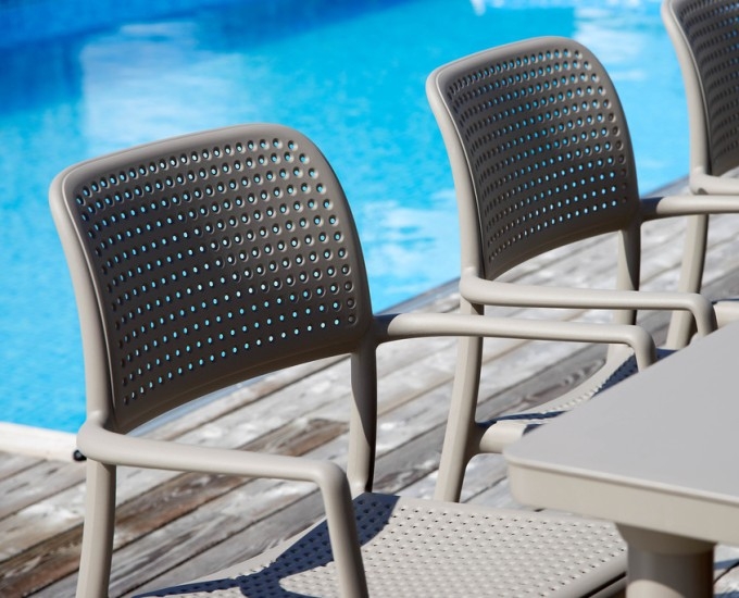 The Bora Arm Chair is simple but beautiful. A uniform coloured monobloc outdoor dining chair with arms, rocking its eye-catching distinctive hole-punch perforated style, which both adds to its visual appeal and very functionally promotes water runoff – perfect for those 4-seasons in a day NZ summers. Designed & made in Italy with high-end polypropylene & fiberglass resin that’s UV and weather resistant.