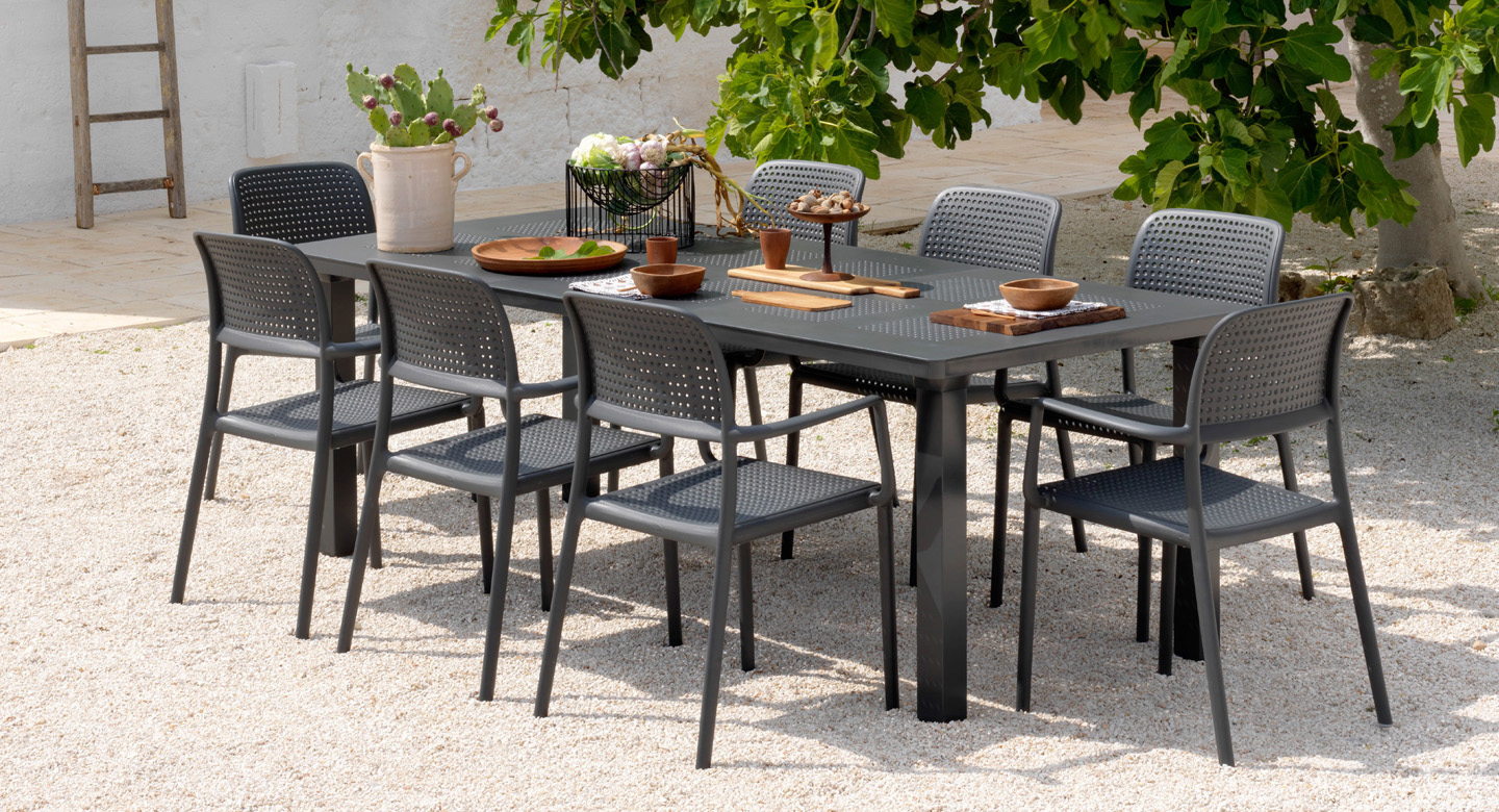 The high-end resin is batch-dyed and treated with an anti ultra-violet (UV) agent, producing collections of chairs & tables that stay vibrant in colour over time, even when they are exposed to atmospheric pollutants and salty sea air (saline) conditions for extended periods.