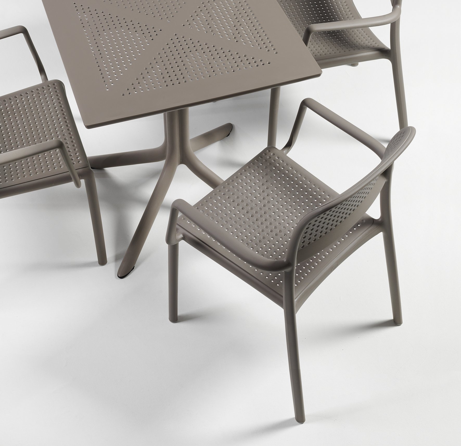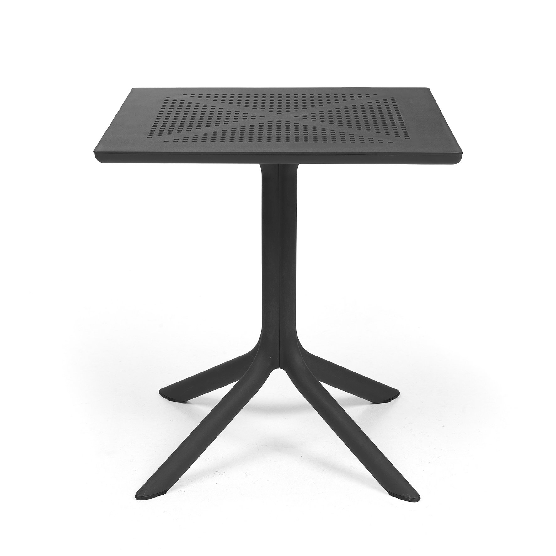 Add a lick of elegant European style to your space with the Clip 70. Designed & made by NARDI of Italy with weather & UV resistant polypropylene & fiberglass resin, making it outdoor safe. Its design is quite minimalist & clean, featuring a unique hole-punch perforated pattern which is both beautiful and functional as it promotes water runoff. The Clip 70’s colour range stocked in NZ includes Charcoal, Taupe & White. These tasteful neutral colours are quite flexible, all with the ability to blend as an accent colour or pop against surrounding contrasting décor. The Clip 70 has a 700mm X 700mm top, which seats four and is great for areas where space is at a premium. 700mm X 700mm is a perfect size to set a table for two, however, it can feel a bit on the cramped side if you are wanting to serve dinner for four regularly – in which case, if your space will allow, you could consider its sister table the Clip 80 with an 800mm X 800mm table top (standard restaurant & café square table size for four). The Clip 70 carries with it a 2-year manufacturer backed commercial grade warranty, making this table suitable for commercial use in venues such as restaurants, cafes and bars, while also providing great peace of mind to residential customers who are quality conscious.