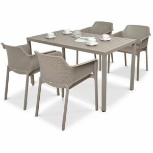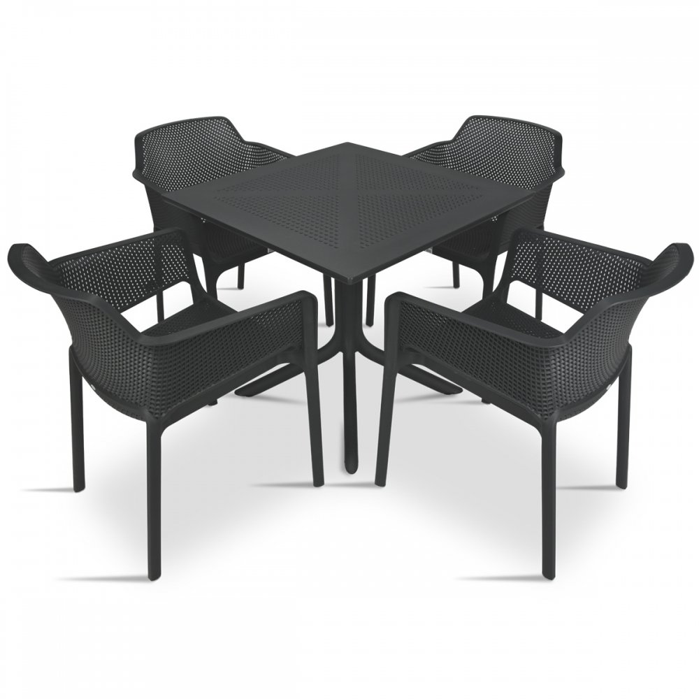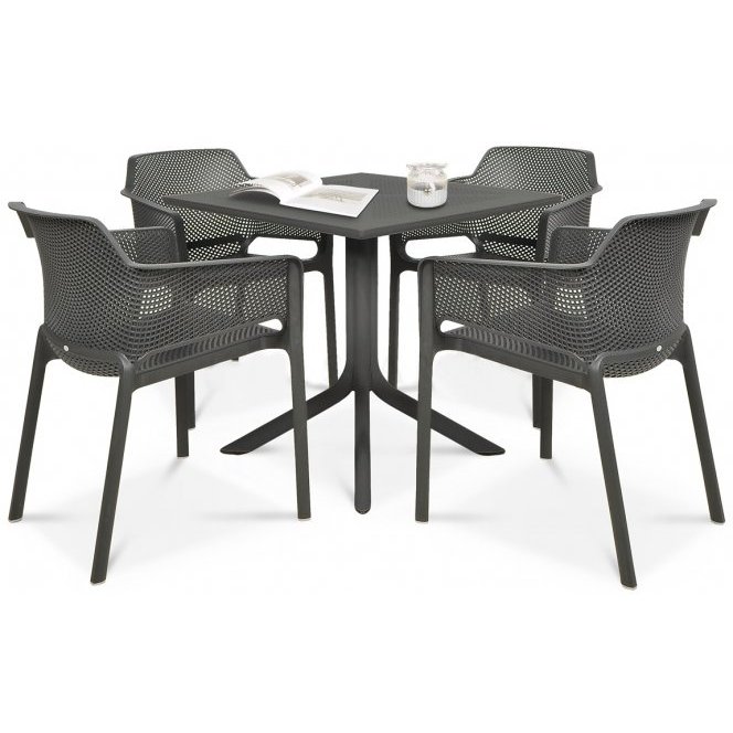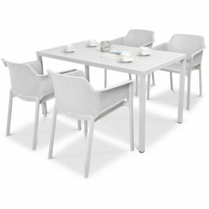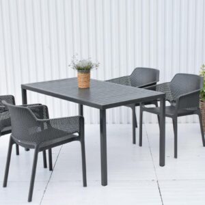 The Clip Net 5-Piece Garden Set is the combination of the super comfy Net outdoor armchair and the Clip 80 outdoor patio table. The chair’s arms are slightly higher, running from 670mm – 690mm at the back, and provide an elevated level of comfort, especially when sitting back and giving in to the ergonomic contours.