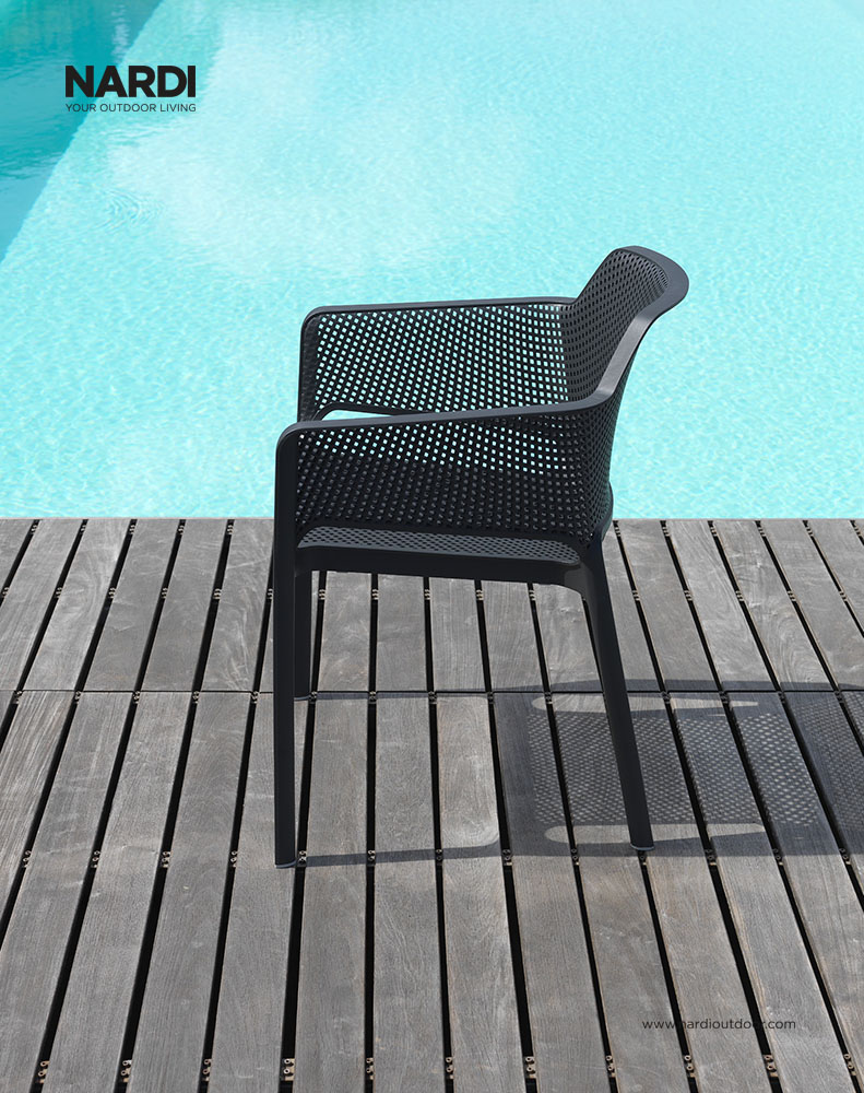 The Net Collection contains a range of outdoor chairs with arms, without arms, outdoor coffee tables & outdoor bar stools. Designed & made by NARDI of Italy.