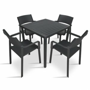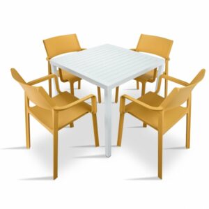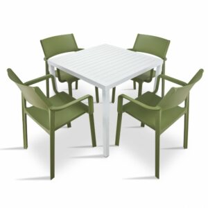 A beautiful Italian made & designed 4-seater garden table and chairs set. Made with UV & weather resistant Polypropylene & Fiberglass Resin which is commercial grade, easy to clean, and ultra-low maintenance.