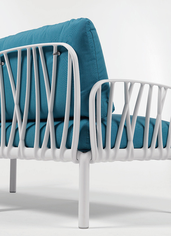 Simple and intuitive grid-based system on which padded cushions, the armrests and backs can be attached on all sides, easily with the snap attachment method or the click in place method for the cushions.