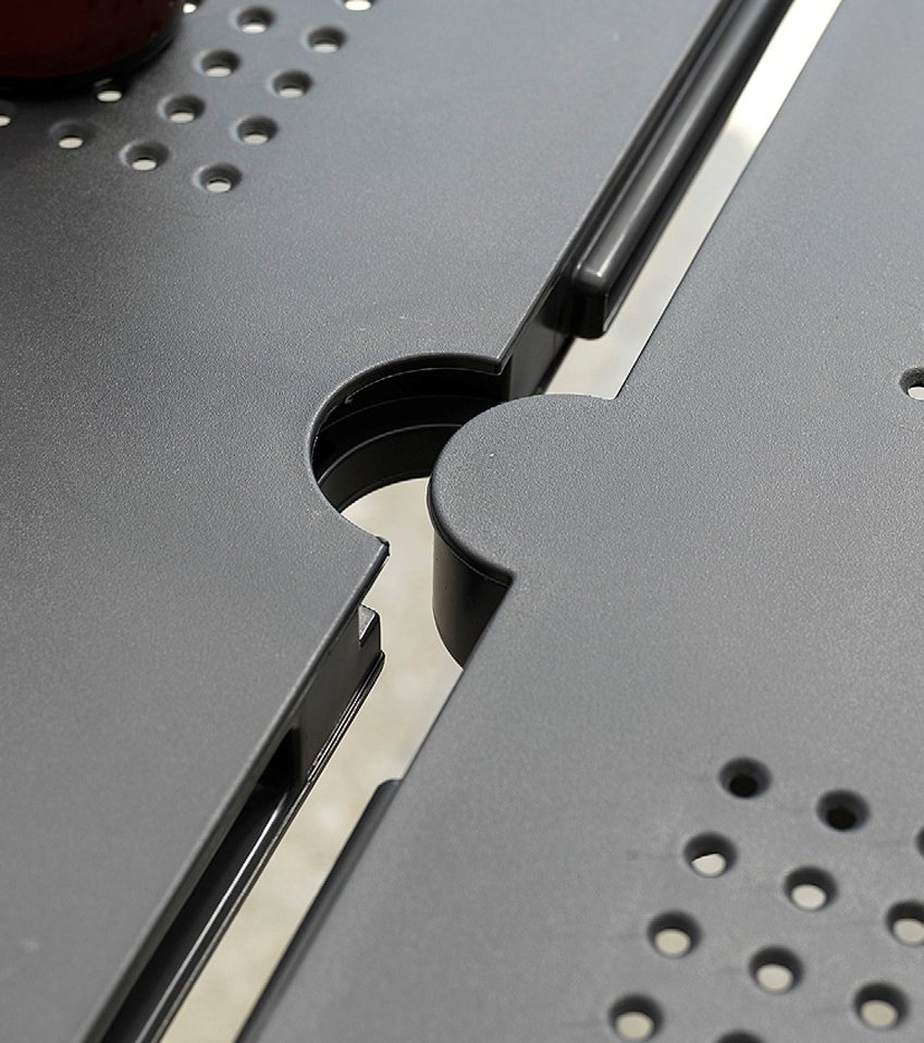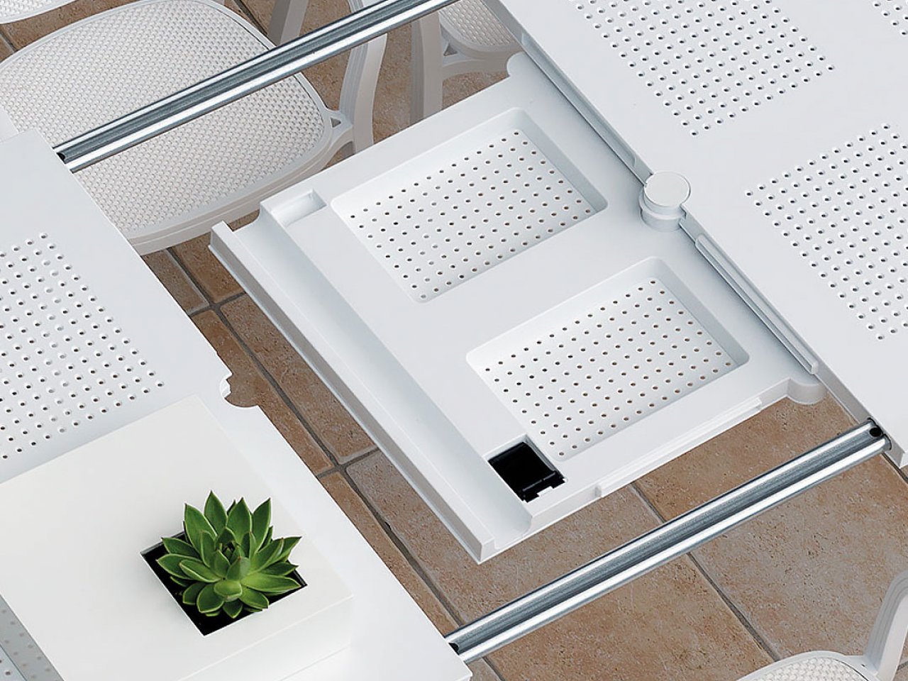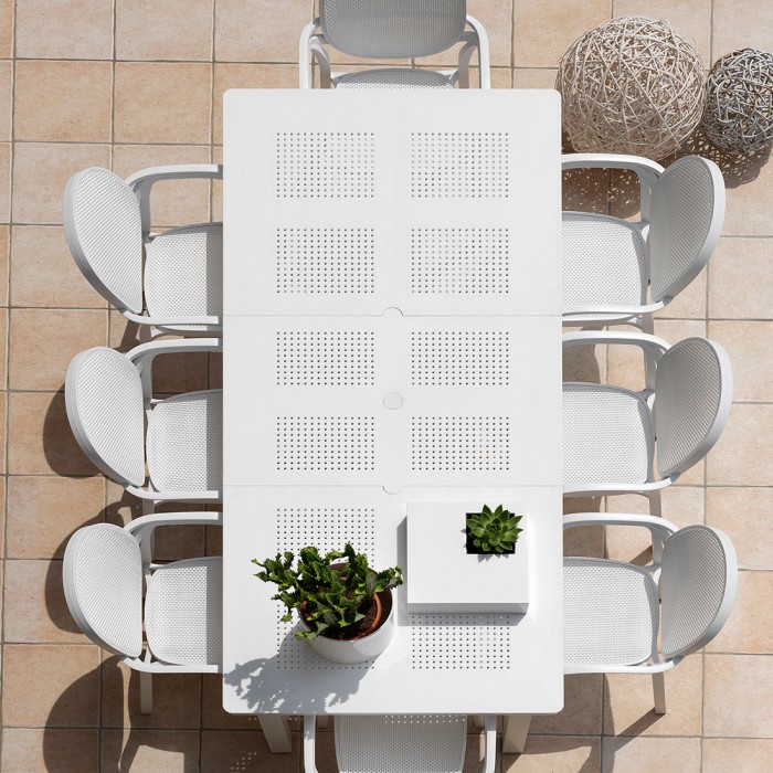 The Libeccio 160/220’s colour range includes the Dark Charcoal, White & Taupe options. All are uniform mono-colour options which contribute to its European feel and charm. Central to its design is its unique hole punch perforation pattern which gives a contemporary, clean style. Its also functional as it promotes water runoff. The polypropylene & fiberglass resin and powder coated aluminium construction makes this table ultra-low maintenance, requiring a mild soap & water solution and wet cloth to clean.