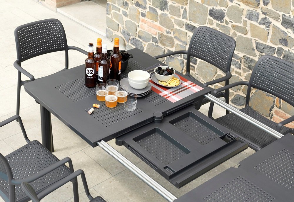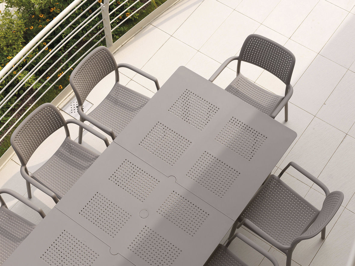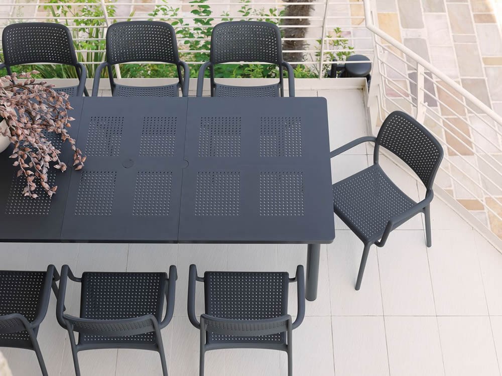 The Libeccio 160/220 extendable outdoor dining table designed & manufactured by NARDI of Italy with table top made of weather & UV resistant polypropylene & fiberglass resin & powder coated aluminium legs. The table’s native length of 1600mm will comfortably seat 6, while its extended length of 2200mm will seat 8. Its 1000mm width allows for a full-size setting & leaves enough room for larger shared serving dishes, perfect for summer dinner parties.