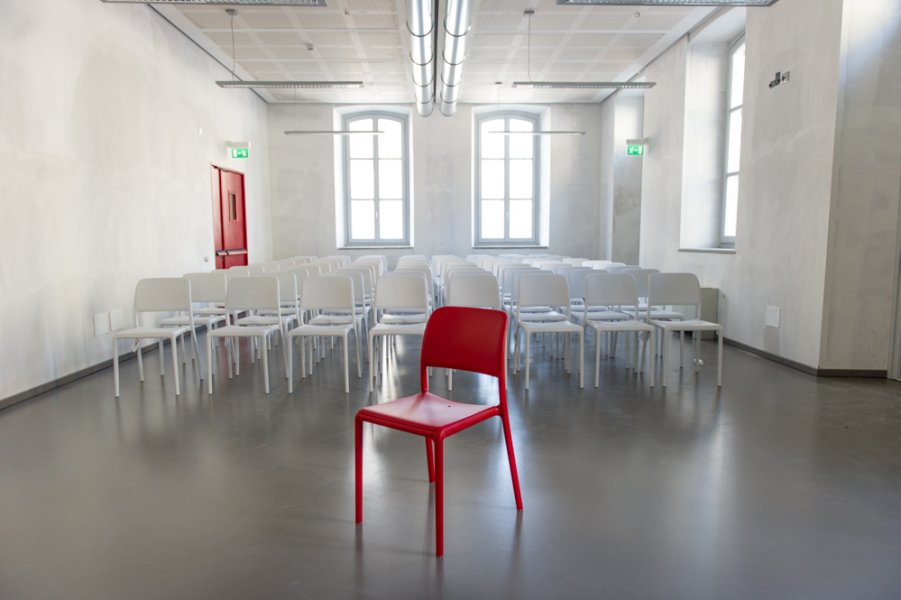 Fibreglass seat without armrests and clean and essential lines. Seamless tubular frame with rounded corners and profile; the seat and back form a single piece. Lightweight, easy to handle and stackable.