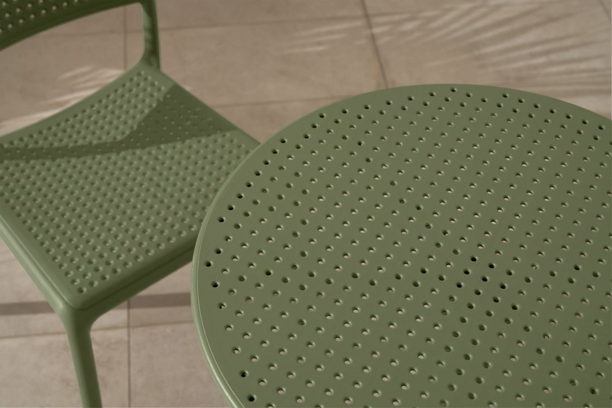 The Step Bistro 3-Piece Balcony Setting is the resulting combination of the Bora Bistro Chair and the Step Patio Table / Coffee Table (interchangeable stem to swap between coffee table height & regular table height). The entire set has a hole-punch perforation pattern, which promotes water run-off and adds breathability on those hot summer days, while also contributing significantly to the beauty of the set.