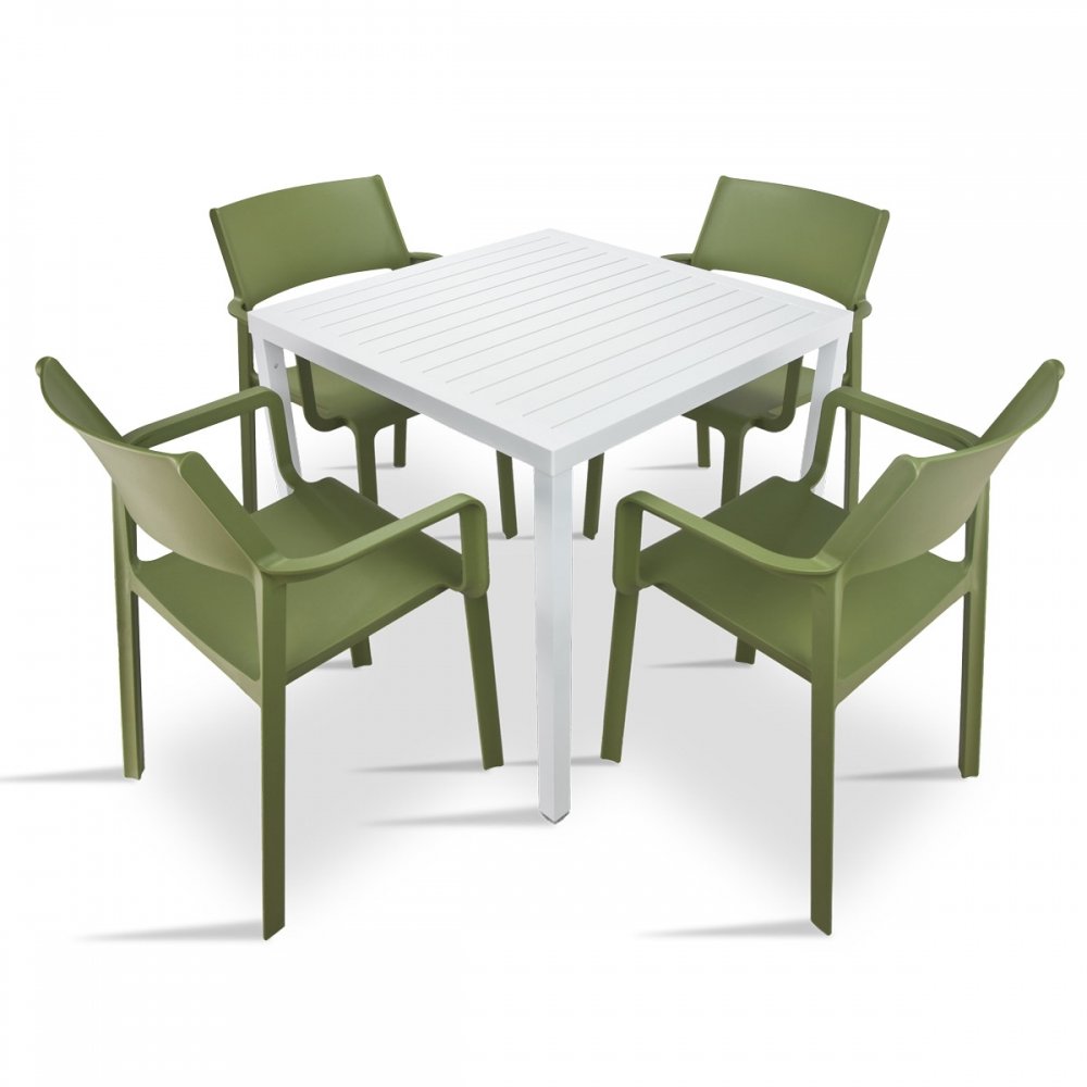 The Trill Cube 5-Piece Patio Set is the resulting of the combination of the Trill Outdoor Armchair and Cube 80 4-leg Outdoor Patio Table, in either a uniform single colour or dual colour contrast, with a matte finish. The small outdoor dining table’s design throws back to its wooden ancestors with mock wood-slats, complete with faux wood grain.